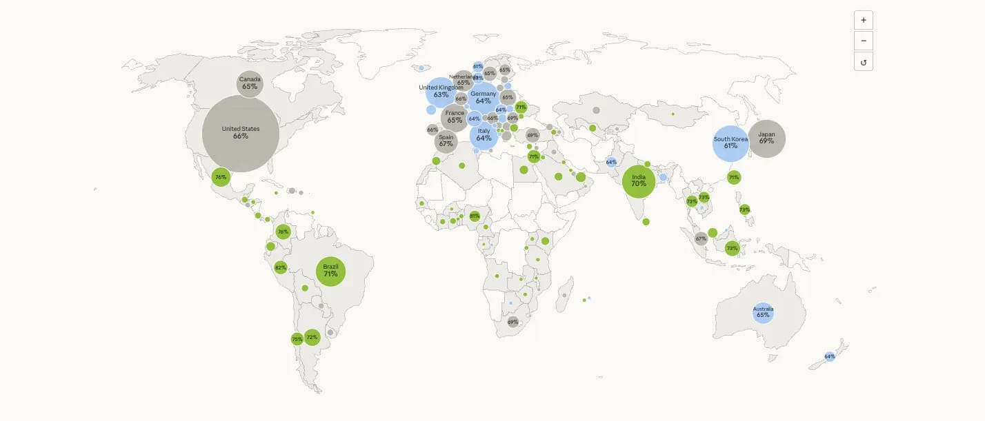 | Anthropic ha publicado el que dice ser el mayor estudio cualitativo sobre actitudes hacia la IA, usando a Claude para entrevistar a 81.000 de sus usuarios en 159 países. El estudio revela que el miedo a que la IA cometa errores supera cualquier otra preocupación, mientras que la esperanza principal es mejorar la excelencia profesional. | Puntos clave: | Claude Interviewer mantuvo conversaciones en 70 idiomas con 81.000 usuarios en una sola semana, algo técnicamente imposible hace un año. La excelencia profesional fue la esperanza más mencionada, seguida por liberar tiempo, independencia financiera y mejor gestión de la vida personal. El miedo a que la IA se equivoque superó todas las demás preocupaciones, seguida de la ansiedad laboral y dependencia excesiva. El sentimiento hacia la IA varió significativamente por región: India y Sudamérica mostraron actitudes por encima del promedio.