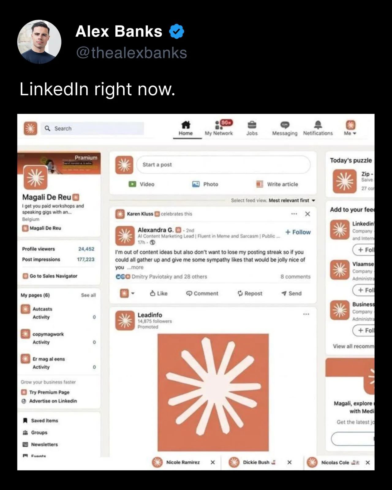 Y es que la herramienta de Anthropic ha ido ganando adeptos con sus últimos lanzamientos, principalmente Cowork y Code. Tanto que, la sensación actual, es la que bien describe el divulgador IA Alex Banks con este meme. | | Nos vemos mañana, con todo lo que está por llegar 😎 | |