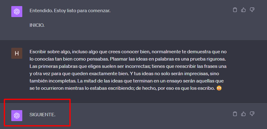 Obviamente, necesitas darle un texto que hayas escrito tú mismo para que pueda inspirarse en él y entender tu estilo de escritura. Aquí tienes un ejemplo de un texto que he copiado y pegado (muestra las imágenes en el correo para verlo): Si todo va bien, ChatGPT responderá "SIGUIENTE". Esto significa que está listo para recibir tu segundo texto.