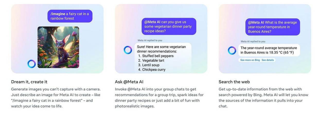 Puedes ver el video 👇 Y Siguiendo con Meta, ¡madre mía! Han hecho más lanzamientos que la NASA 🚀 Los apuntes más importantes os dejamos aquí: Asistente de IA de MetaEl nuevo asistente de IA de Meta ofrece respuestas y genera imágenes en tiempo real en todas sus apps de mensajería. Colabora con Bing para búsquedas web y puede responder preguntas generales, buscar datos y más. Nuevos Productos de MetaMeta ha lanzado el casco de realidad virtual Quest 3 con gráficos y resolución mejorados. Sus nuevas gafas inteligentes Ray-Ban permiten grabar y compartir transmisiones en vivo. ![]() Herramientas y CaracterísticasMeta facilitará la creación de chatbots para empresas y añadirá pegatinas generadas por IA y funciones de edición de imágenes a sus apps. 📰 La ultima noticia:Transcripciones de IA en Spotify.