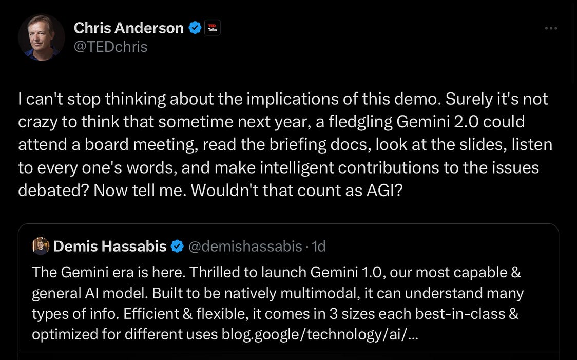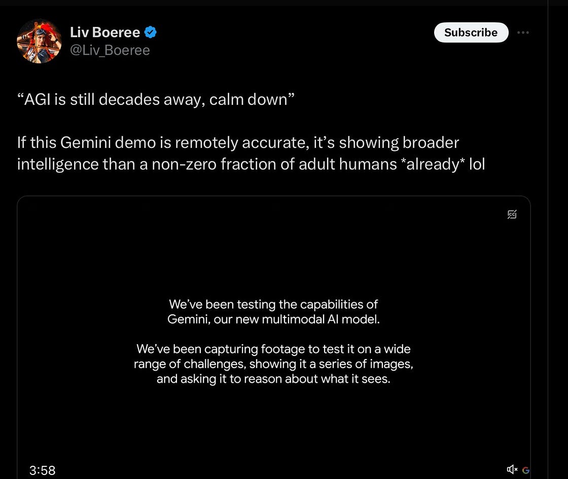 Parece que fue ayer cuando Google anunció Gemini con un video espectacular, mostrando interacciones en tiempo real increíbles (el enlace está justo arriba). Algunos de mis amigos y colegas se emocionaron mucho con ello publicando tuits como este o generando un hype que no existe! Mirad algunos twits en inglés, otros en español y en varios otros idiomas!. Y De hecho, el mismo día del lanzamiento de Google cuando realmente publicó ese video. Pero, siendo sincero y desde mi experiencia en el sector tecnológico, no lo vi completo. Ya no me impresionan fácilmente estas cosas. ¿La razón? Rara vez el video refleja la realidad completa. Lo diferente esta vez es que la verdad se reveló bastante rápido... Suscríbase a Evolupedia para leer el resto.Conviértase en un suscriptor de pago de Evolupedia para obtener acceso a este Post y a otros contenidos exclusivos para suscriptores. Una suscripción le ofrece: