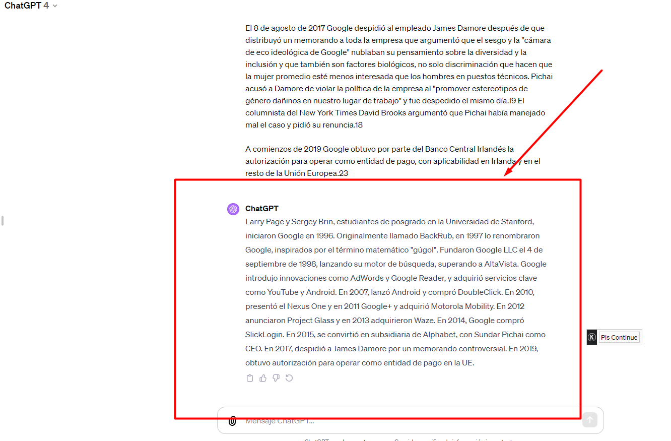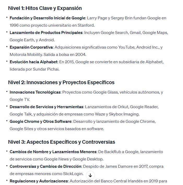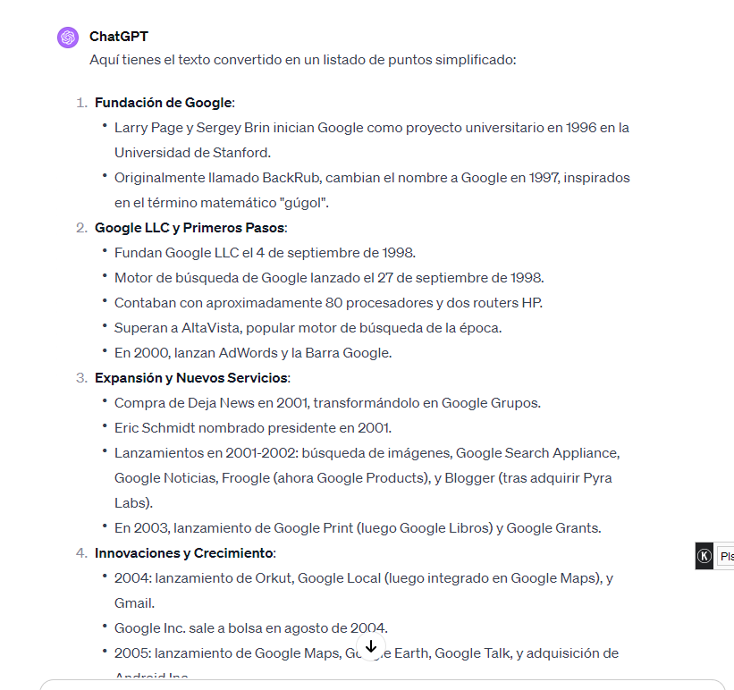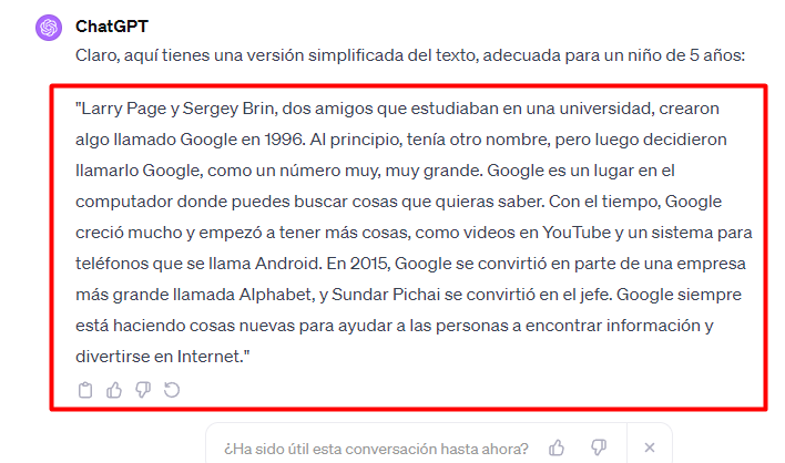 El resultado es el siguiente: Larry Page y Sergey Brin, estudiantes de posgrado en la Universidad de Stanford, iniciaron Google en 1996. Originalmente llamado BackRub, en 1997 lo renombraron Google, inspirados por el término matemático "gúgol". Fundaron Google LLC el 4 de septiembre de 1998, lanzando su motor de búsqueda, superando a AltaVista. Google introdujo innovaciones como AdWords y Google Reader, y adquirió servicios clave como YouTube y Android. En 2007, lanzó Android y compró DoubleClick. En 2010, presentó el Nexus One y en 2011 Google+ y adquirió Motorola Mobility. En 2012 anunciaron Project Glass y en 2013 adquirieron Waze. En 2014, Google compró SlickLogin. En 2015, se convirtió en subsidiaria de Alphabet, con Sundar Pichai como CEO. En 2017, despidió a James Damore por un memorando controversial. En 2019, obtuvo autorización para operar como entidad de pago en la UE. TIP! 💡¿Qué debes tener en cuenta? Dejar que ChatGPT determine cuáles son los puntos principales provoca que algunos detalles importantes se pierdan por el camino en el texto resumido. Puedes indicarle que incluya elementos específicos del texto original. Truco 2 obtén una explicación simplificadaOtra función curiosa de ChatGPT es la de simplificar un texto hasta el punto de que sea entendible para un niño de 5 años. ¿Cómo hacerlo? Esta es la orden recomendada: