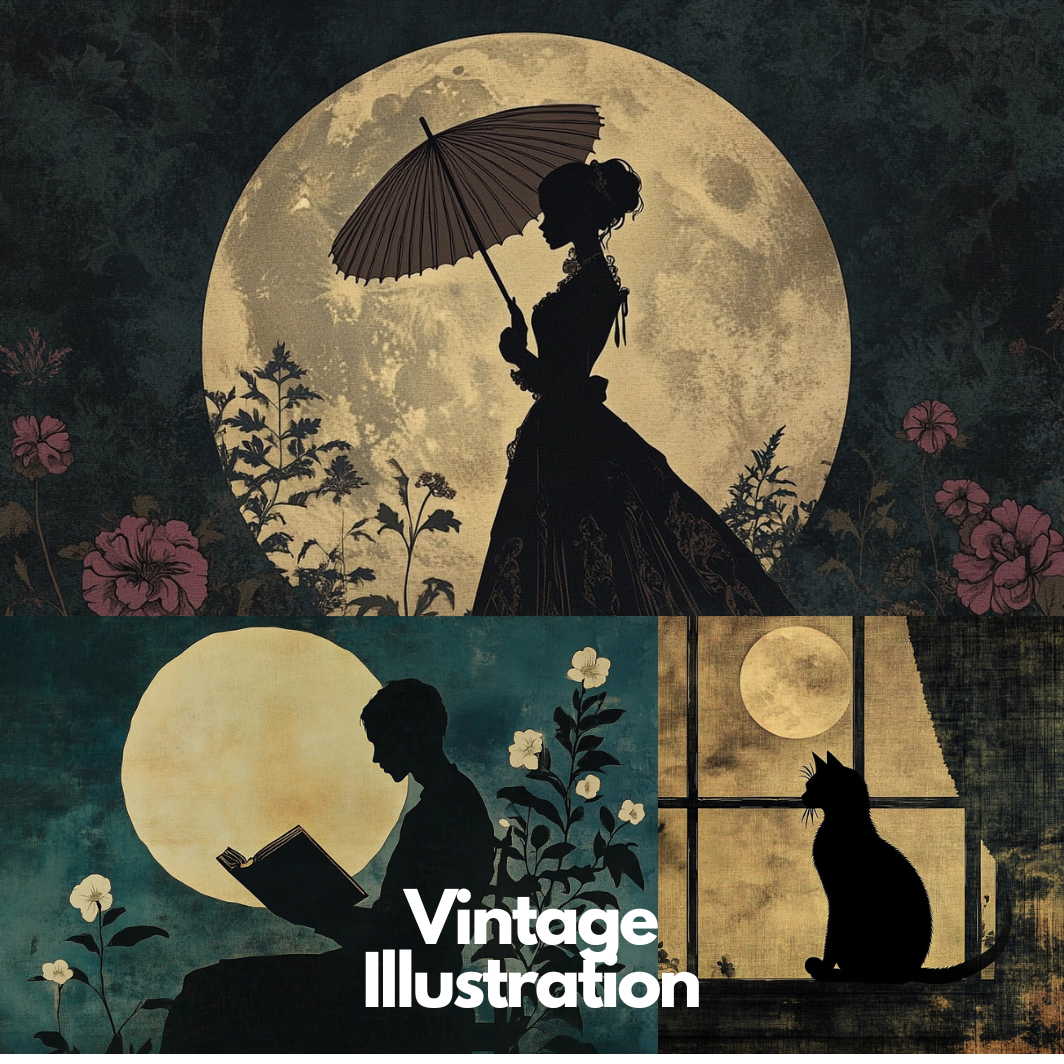 Vintage Illustration, Art Deco Style, Silhouette of [Subject], with the moon in the background | Dark Academia Aesthetic | Full body portrait, Victorian-Inspired, Tapestry-Like | [Colors] | Flowercore elements --ar 3:2