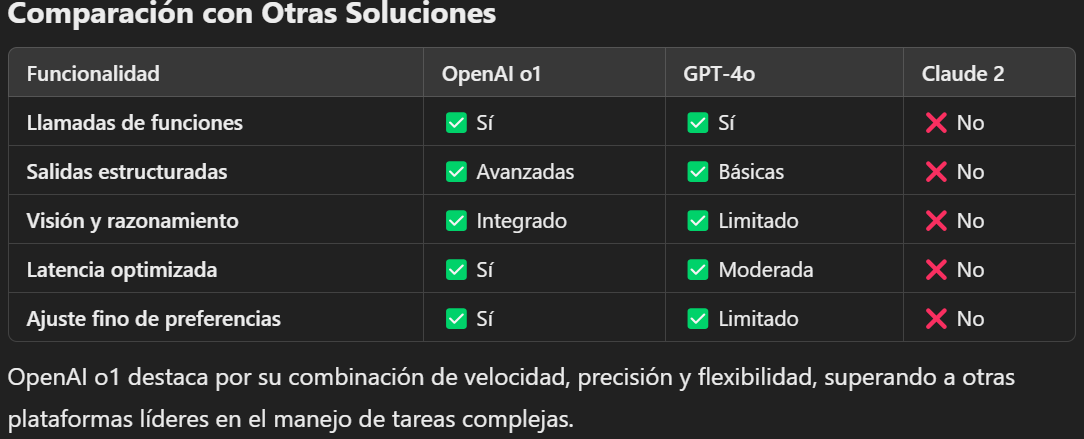 ConclusiónEl lanzamiento de OpenAI o1 y sus herramientas asociadas redefine el desarrollo con inteligencia artificial, permitiendo a los desarrolladores crear aplicaciones más robustas y personalizables. Gracias a innovaciones como WebRTC, ajuste fino de preferencias y nuevos SDK, OpenAI ofrece una solución integral para la próxima generación de aplicaciones impulsadas por IA. ¿Estás listo para explorar nuevas posibilidades? Consulta la documentación y comienza a construir hoy mismo. 🛠️Workshop de creación de agentes¡No te pierdas este workshop único sobre creación de agentes inteligentes! ¿Quieres aprender desde cero cómo diseñar asistentes virtuales y explorar las últimas herramientas de inteligencia artificial? Este taller está diseñado para llevarte de principiante a experto en IA. 🎯 Qué aprenderás: 📅 Fecha: 11 de febrero de 2025 👥 Ponentes destacados: 🎟️ Regístrate y asegura tu lugar ahora! ¡Forma parte del futuro y lleva tus habilidades al siguiente nivel! 💡 ¡Disfrutad y que tengáis un excelente día!Actualmente eres un suscriptor gratuito de Evolupedia. Para la experiencia completa, actualice a la comunidad prime: A ella tienes acceso a:
