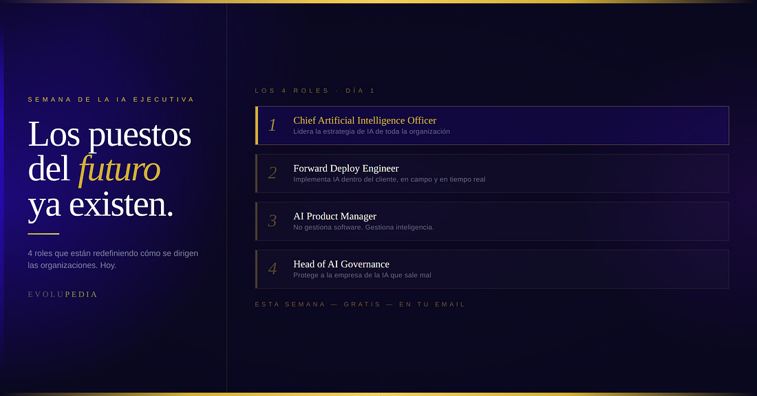 Bienvenidos a la comunidad de IA y Robótica mas grande de España y Latinoamérica! Hola comunidad, A estas alturas la mayoría ya tenemos claro qué es ChatGPT, Claude o Gemini. Muchos los usáis a diario. Algunos ya experimentáis con agentes con nuestro apoyo y nuestra certificación Automation & AI Agent Manager. El nivel ha subido y eso nos alegra.😌 Pero hay algo que llevamos tiempo observando y que nos preocupa bastante. Las empresas están fallando de forma sistemática en la implementación de la IA. Gartner lo documenta: el 80% de los proyectos de IA en organizaciones no llega a producción o no genera el retorno esperado. Y las razones se repiten siempre: falta de liderazgo claro, ausencia de estrategia real, y nula gestión del cambio organizacional. Por eso nace esta Edición Empresarial de los lunes! Si eres líder, quieres transformar tu organización, aspiras a ser el próximo referente en estrategia de IA dentro de tu empresa, entender qué está pasando realmente en las organizaciones, las herramientas que usan los equipos directivos y cómo las empresas del IBEX 35 y la Fortune 500 están implementando inteligencia artificial — esto es para vosotros. Y para empezar con todo, arrancamos con la Semana de la IA Ejecutiva. Siete días, siete emails sobre liderazgo e inteligencia artificial en las organizaciones. Bienvenidos a la Edición Empresarial de EvolupedIA.. si os gusta esta edición.. compártelo Empezamos: 👇🏼 Día 1 de la semana ejecutiva IA Los 4 roles del futuro presentePara empezar, hablaremos de lo que en Silicon Valley — donde están OpenAI, Anthropic y las grandes tecnológicas — ya es una realidad asumida. Pero no solo en el país del Tío Sam. También en China, donde no hablan de tendencias sino de transformaciones que avanzan a una velocidad que Europa y Latinoamérica apenas están empezando a comprender. Hoy hablamos de puestos de trabajo. Concretamente, de los que ya están cambiando la estructura de las organizaciones más avanzadas del mundo. Los puestos del futuro presente — una edición especial sobre lo que veremos en los próximos dos años en Europa y Latinoamérica. No son tendencias. No son predicciones. Son perfiles que existen hoy, que las empresas más avanzadas del mundo ya tienen, y que la mayoría de organizaciones en España y Latinoamérica todavía no saben que necesitan. El primero! 1. Chief Artificial Intelligence Officer (CAIO) En julio de 2024, AllianceBernstein — una de las gestoras de activos más grandes del mundo con más de 700.000 millones de dólares bajo gestión — creó un nuevo cargo en su comité de dirección. No era un CTO. No era un CDO. Era su primer Chief Artificial Intelligence Officer. Ese mismo año, SAP nombró a su CAIO con mandato directo sobre toda la estrategia de IA de la compañía. Globe Telecom hizo lo mismo en Asia. Y el gobierno de Estados Unidos mandató por ley que todas las agencias federales nombraran un CAIO en un plazo de 60 días. Hoy, según IBM, el 26% de las organizaciones globales ya tienen un CAIO — el doble que hace dos años. Y las que lo tienen reportan un 10% más de retorno sobre su inversión en IA que las que no. ¿Qué hace exactamente? No escribe código. No entrena modelos. No hace demos de ChatGPT en el all-hands. Se sienta en la dirección y responde a la pregunta que el CEO, el CFO, los directivos, ¿cómo está usando esta organización la inteligencia artificial para ganar dinero, reducir costes, gestionar riesgos y no quedarse atrás? Decide qué proyectos de IA se aprueban y cuáles se matan. Evalúa vendors. Gobierna los riesgos éticos y legales. Traduce lo que hace el equipo técnico en lenguaje que entiende el consejo de administración. Un ejemplo: El CAIO de DEWA — la autoridad de agua y electricidad de Dubái — lideró la implementación de un asistente de IA que mejoró la atención al cliente y generó más de 22 millones de dirhams en ahorros directos. No fue el CTO quien lo hizo. Fue el ejecutivo responsable de la estrategia de IA. A este rol le dedicamos el resto de la semana. Es el más importante, el más nuevo y el que más oportunidades abre para alguien con perfil directivo. Salario promedio Global: 300.OOO usd! Siguiente: 2. Forward Deploy Engineer Este perfil nació en Palantir y está llegando al resto del mercado más rápido de lo que nadie esperaba. La lógica del software tradicional es esta: construyes un producto, el cliente lo compra, le das soporte. El cliente aprende a usar tu tecnología. El Forward Deploy Engineer da la vuelta a eso completamente. En lugar de esperar a que el cliente aprenda, tú vas a trabajar dentro del cliente. In situ. En su operación. Hablando con sus equipos, viendo dónde están los cuellos de botella reales, entendiendo el negocio desde dentro. Y desde ahí implementas IA donde de verdad duele. No hace presentaciones en PowerPoint. No manda propuestas por email. Escribe código, despliega sistemas, conecta integraciones, y cuando el cliente ya funciona solo, se va. Es el perfil que empresas como Anduril, Scale AI o los brazos de consultoría de IA de las Big Four están buscando con urgencia. Mezcla ingeniería, consultoría de negocio y capacidad de comunicación — y hay muy pocos profesionales que lo hagan bien. Salario promedio: 200.000 usd 3. AI Product Manager El PM de toda la vida gestionaba funcionalidades. Hablaba con usuarios, priorizaba el backlog, coordinaba desarrollo. El producto hacía lo que le programaban. El AI Product Manager gestiona algo radicalmente diferente: sistemas que aprenden, que cambian, que se comportan de formas que nadie programó explícitamente. Cuando el comportamiento de tu producto depende de un modelo de lenguaje, tienes que entender cómo funciona ese modelo. Cuándo alucina. Cómo se evalúa su rendimiento. Qué pasa cuando se actualiza y tu producto cambia de comportamiento sin que nadie haya tocado una línea de código. No necesita entrenar mode