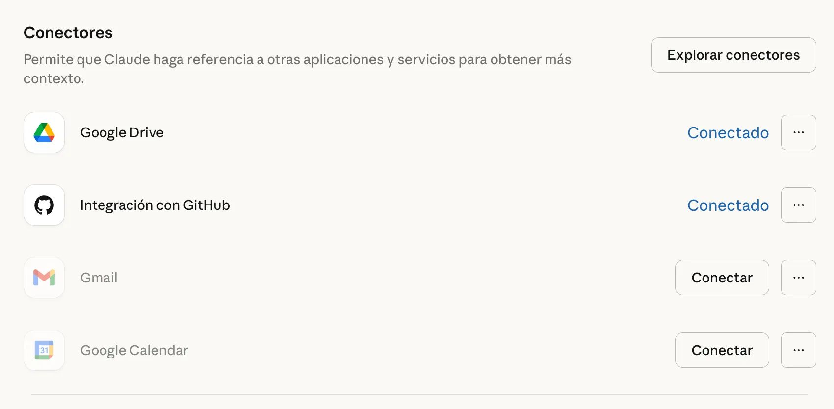 Los conectores permiten que Claude acceda directamente a tus herramientas: Google Drive, Slack, Notion, Figma y muchas más. Una vez conectados, Claude puede buscar en tus documentos, leer tus archivos o consultar tus conversaciones sin que tú tengas que mover un dedo. |