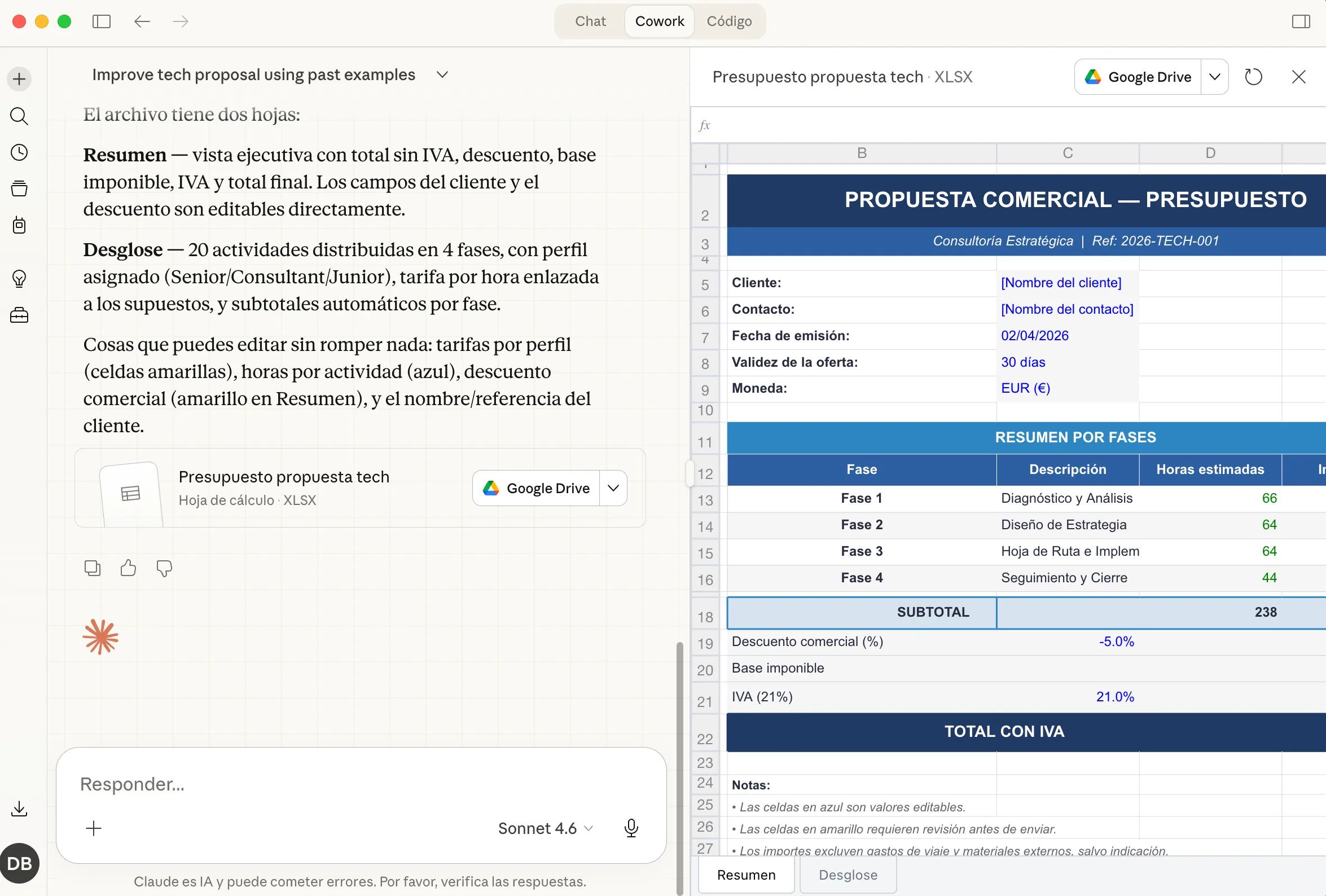 💡 Consejo: Si ya tienes una plantilla de presupuesto que usas siempre, súbela como archivo de contexto. Claude la usará como base y la rellenará con los datos del nuevo cliente. |