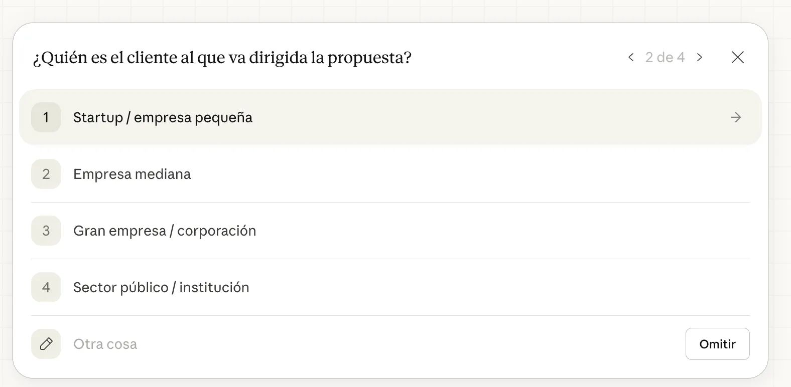 Aquí es donde ocurre la magia. En vez de generar una propuesta genérica, Claude te hará preguntas como: |