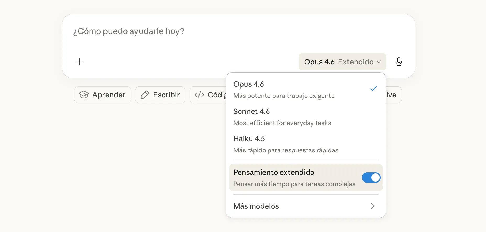 💡 Consejo: No uses Opus 4.6 para todo. Para tareas rápidas y sencillas (resumir un texto corto, responder una pregunta simple), los modelos más ligeros como Sonnet funcionan perfectamente y van más rápido. Guarda Opus para cuando necesites que Claude piense de verdad. |