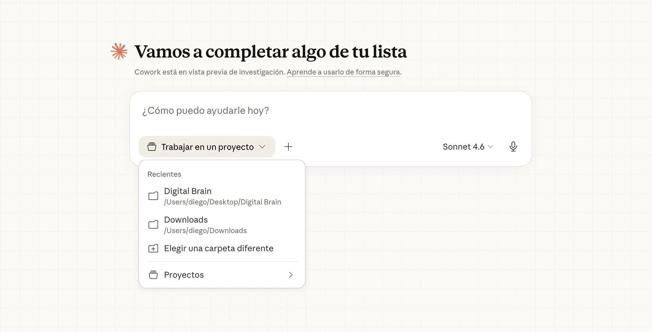 Ahora, en Cowork, selecciona esa carpeta y escribe tu primer prompt: |