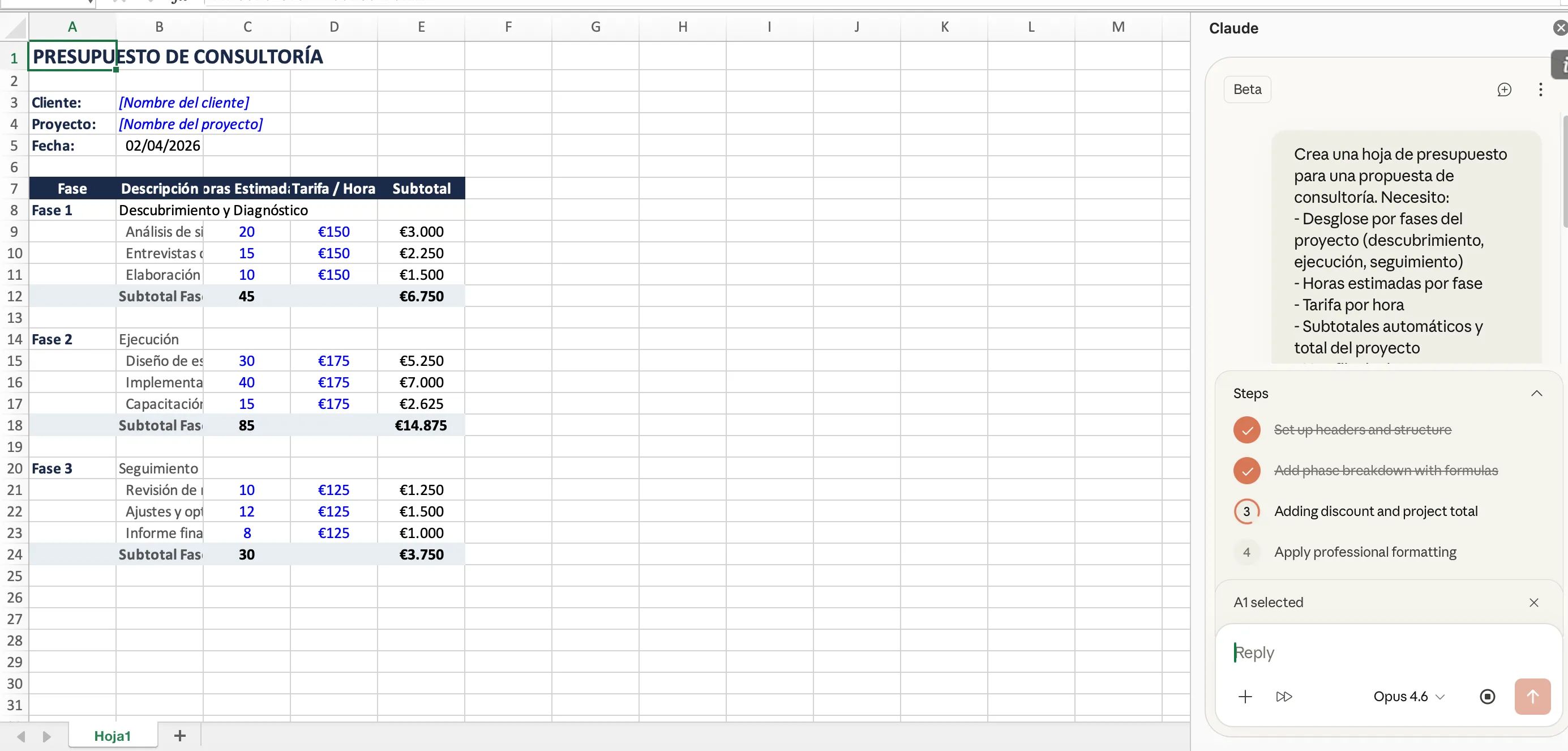 Toda buena propuesta necesita un presupuesto desglosado. Y aquí es donde Excel entra en juego. Puedes pedirle a Claude dentro de Excel: |