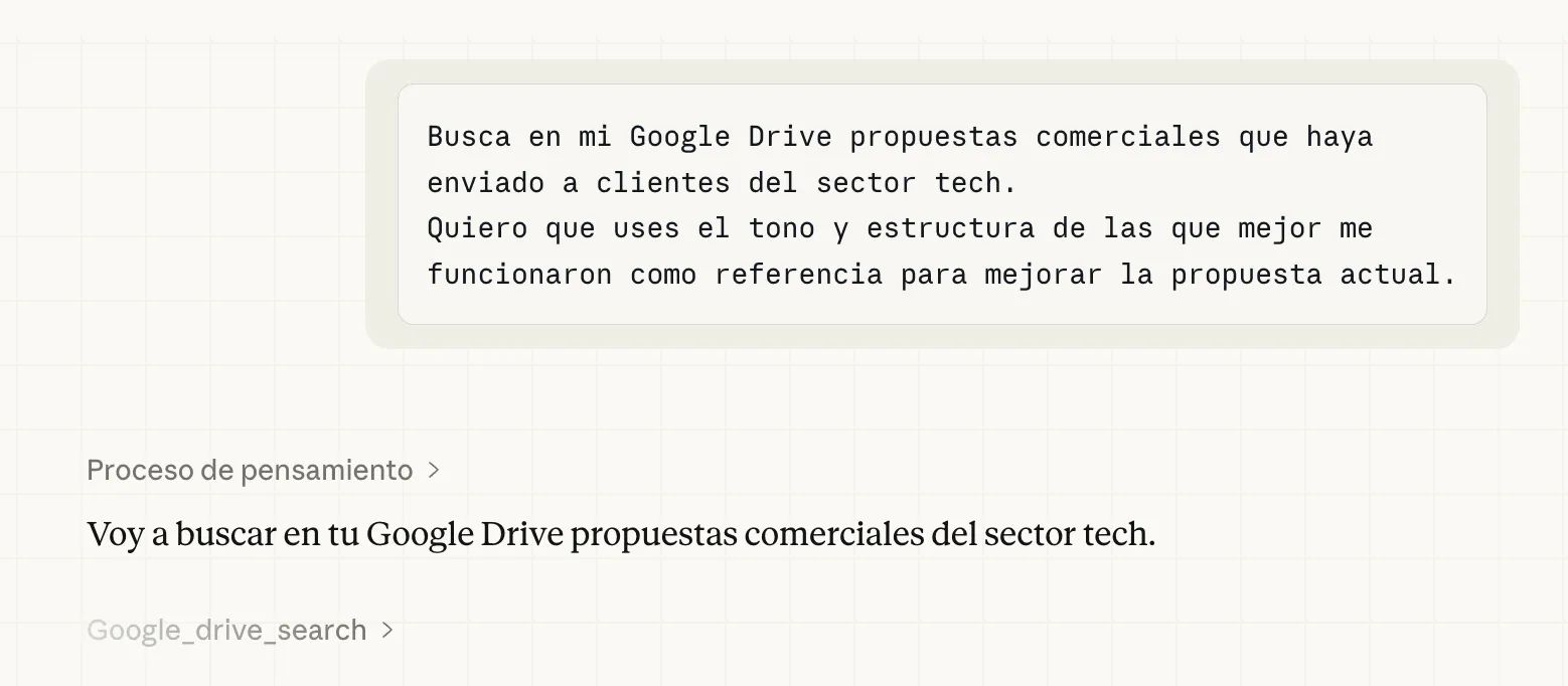 Claude rastreará tu Drive, encontrará documentos relevantes y usará esa información para afinar la propuesta. Sin que hayas tenido que buscar nada manualmente. |