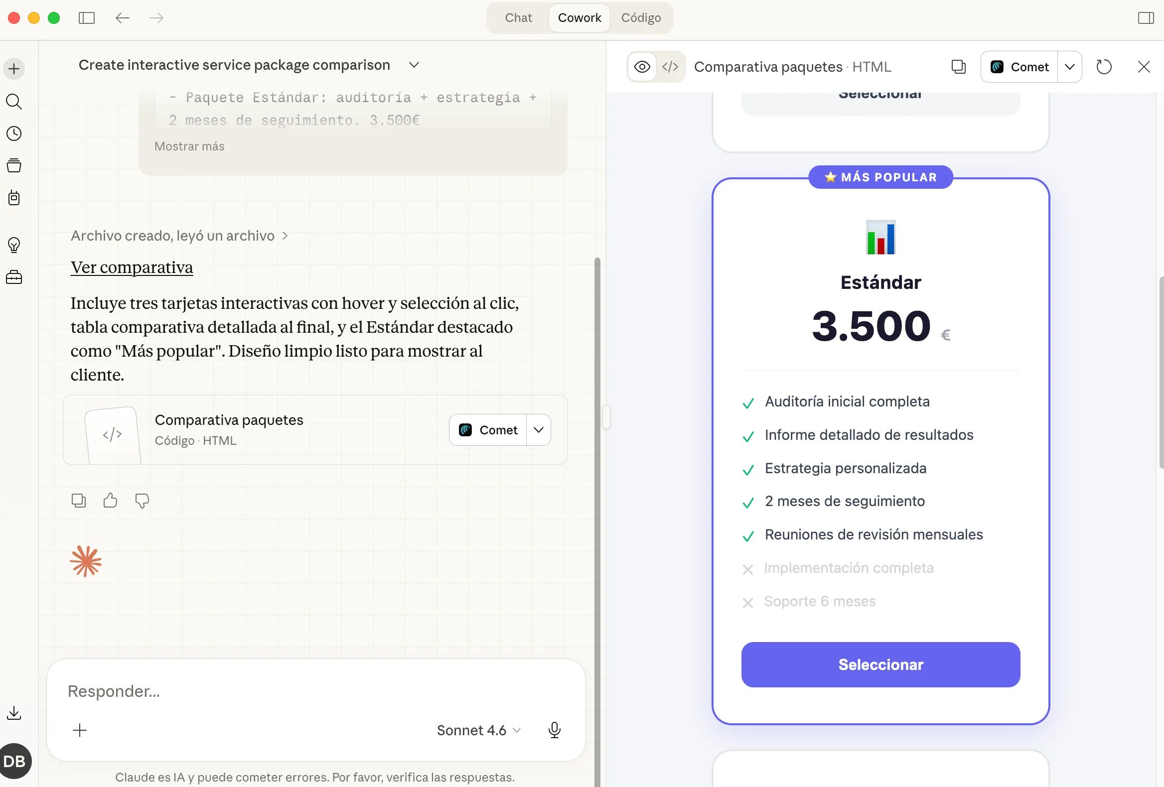 Claude generará una comparativa visual interactiva directamente en el chat. Con columnas, iconos, colores y un diseño que puedes mostrar en una reunión o enviar como enlace. |