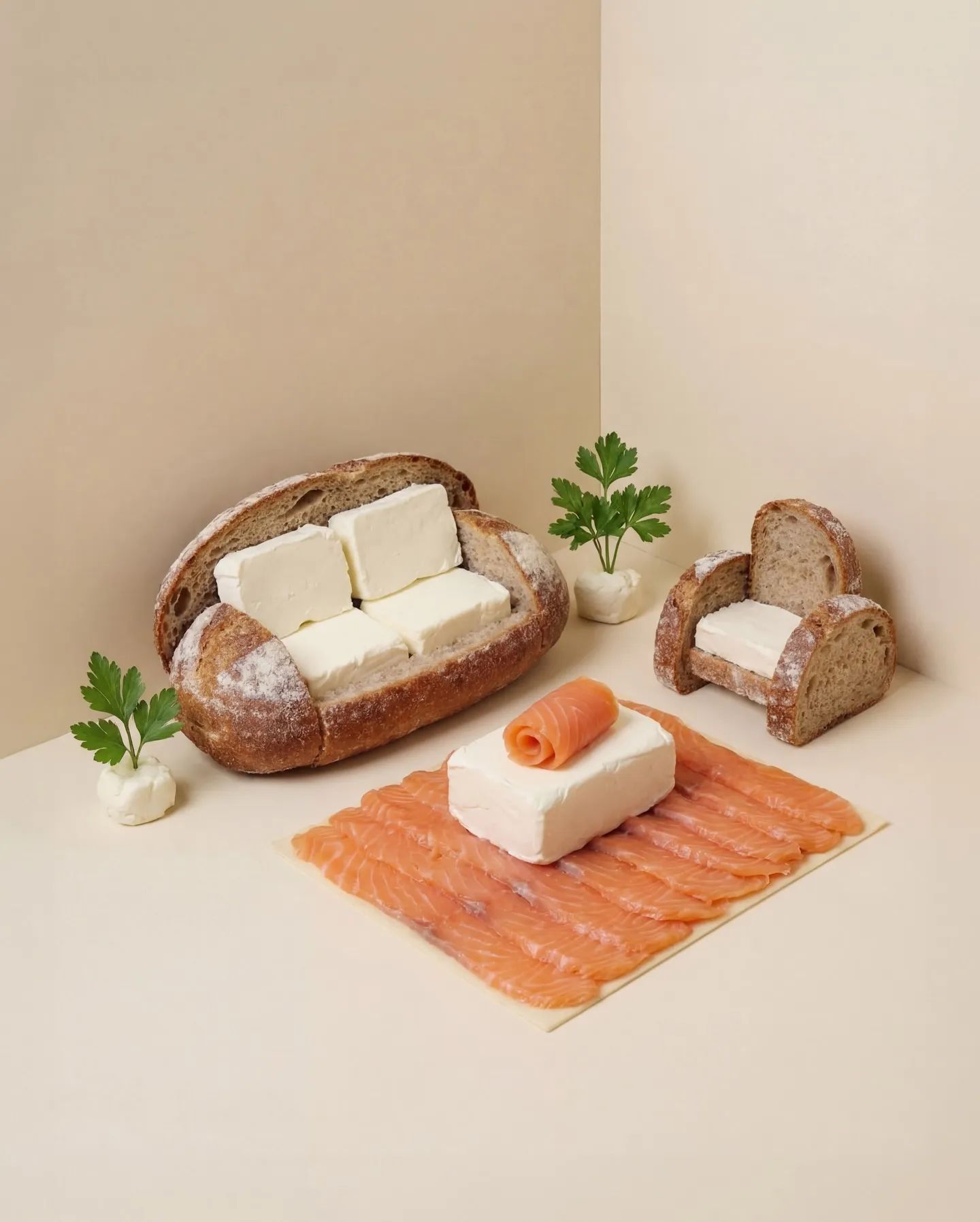 La famosa creativa @joooo.ann nos vuelve a sorprender con una de sus creaciones en miniatura. Esta vez, diferentes habitaciones hechas con pan sobre el que descansan “inquilinos” como el salmón, el caviar o el queso.